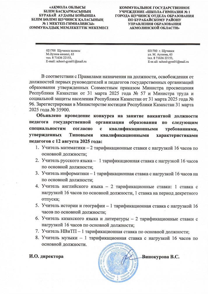 Бос оқытушы лауазымына конкурс туралы хабарландыру