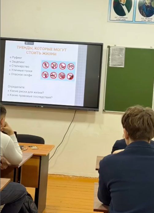 В ходе занятия учащиеся обсудили современные опасные увлечения (руфинг, зацепинг, посещение заброшенных зданий, уличные гонки), определили риски для здоровья и возможные нарушения закона. Особое внимание было уделено ответственности несовершеннолетних и роли закона в обеспечении безопасности общества.