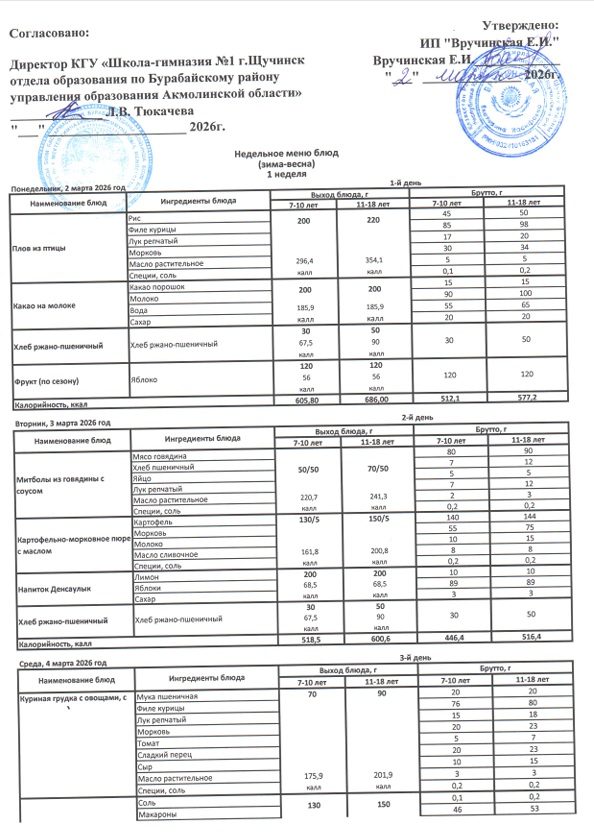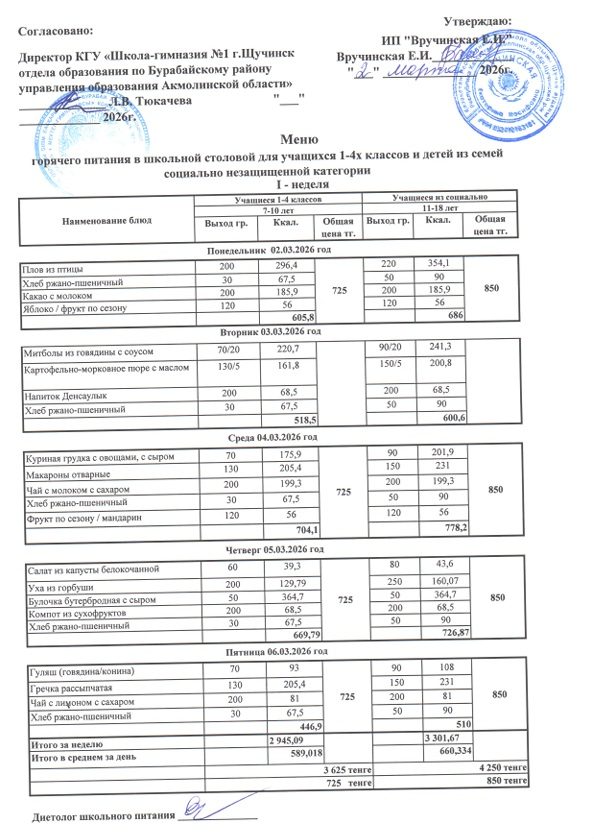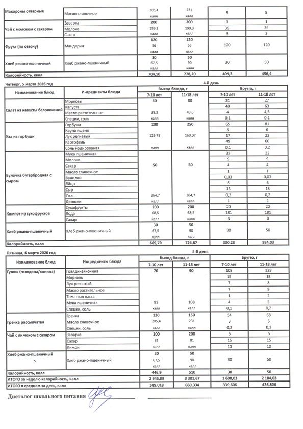 Меню школьного питания 1-4 классы 02.03.2026 - 06.03.2026