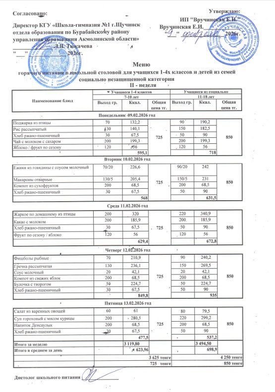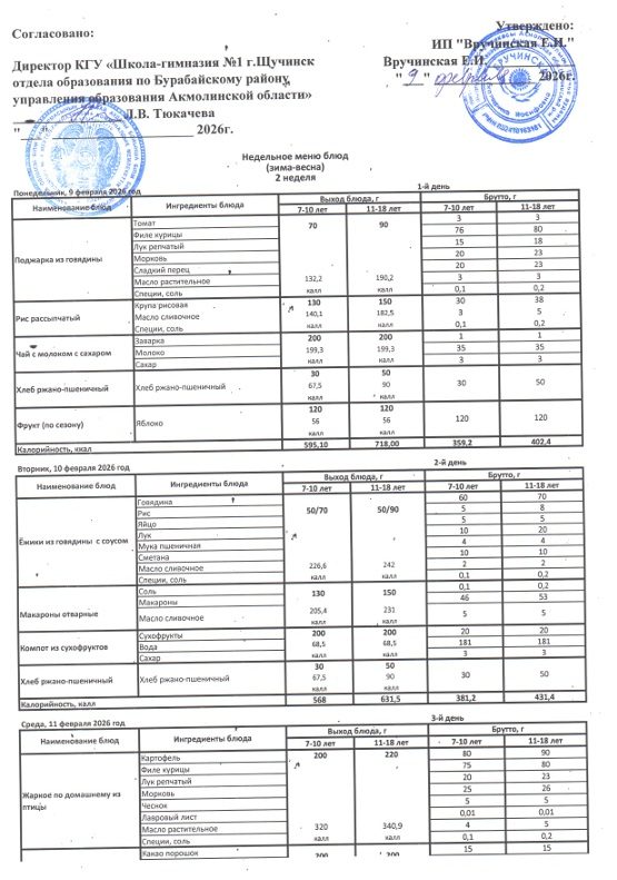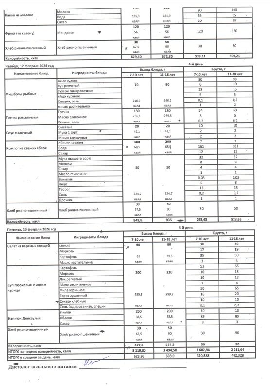 Меню школьного питания 1-4 классы 09.02.2026 - 13.02.2026