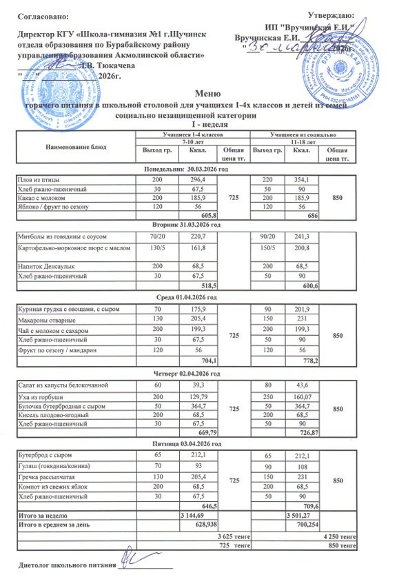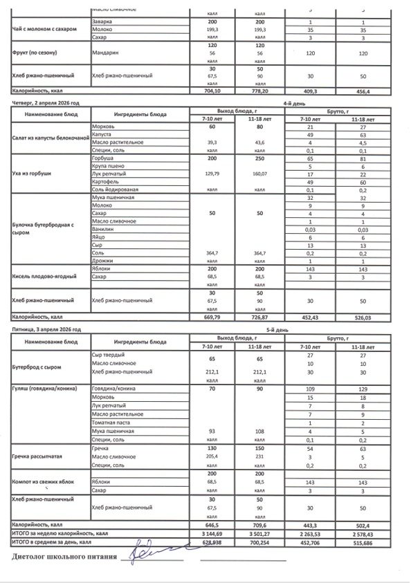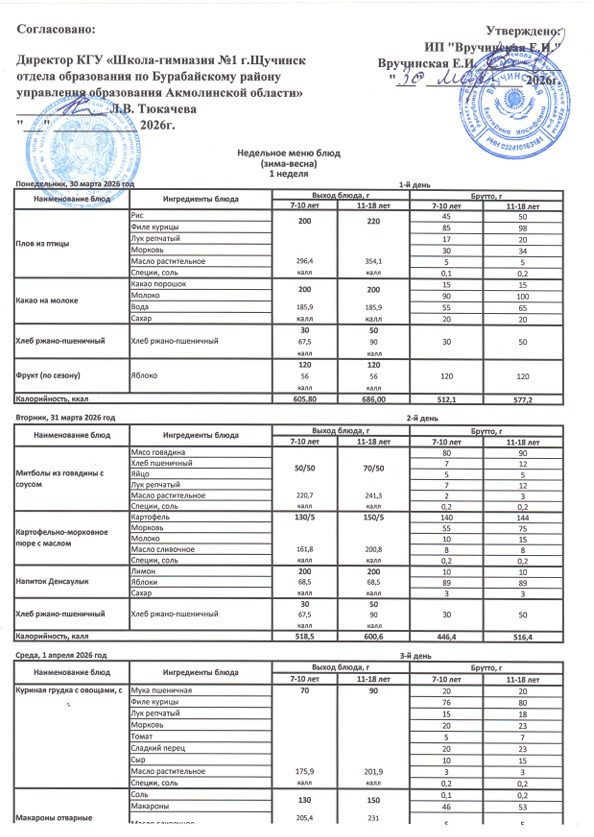 Меню школьного питания 1-4 классы 30.03.2026 - 03.04.2026