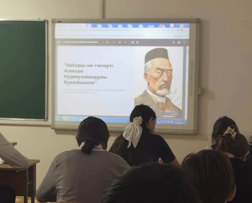 к 160- летию со дня рождения общественного и государственного деятеля, лидера движения «Алаш» Алихана Нурмухамедулы Букейханова прошел открытый классный час в 8 “В” классе на тему “Звезды не гаснут....”
