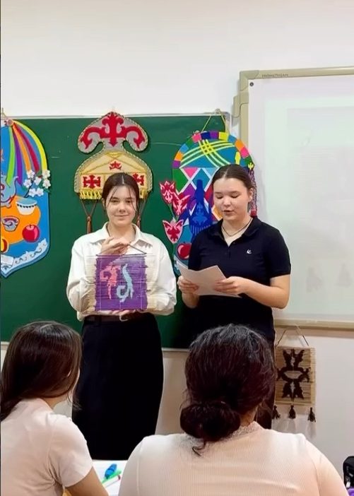 На занятии обучающиеся представили авторские панно, выполненные в технике ши току из шерсти и пряжи с использованием элементов казахского орнамента. Учащиеся рассказали о процессе создания своих работ — от идеи и эскиза до готового изделия.Презентации сопровождались визуальными материалами и демонстрацией готовых изделий. Ребята уверенно представляли свои проекты, отвечали на вопросы и делились творческим опытом.Урок прошёл в творческой атмосфере и стал хорошим примером сочетания декоративно-прикладного искусства и современных технологий презентации.