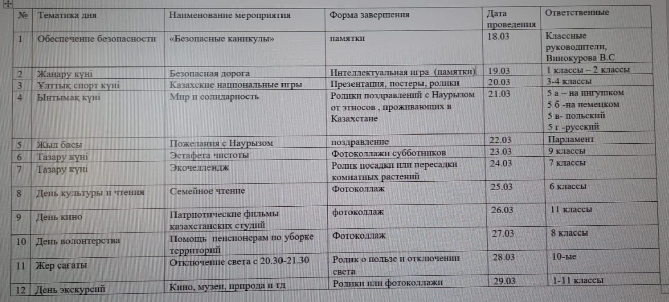 План работы на весенних каникулах 2026г.
