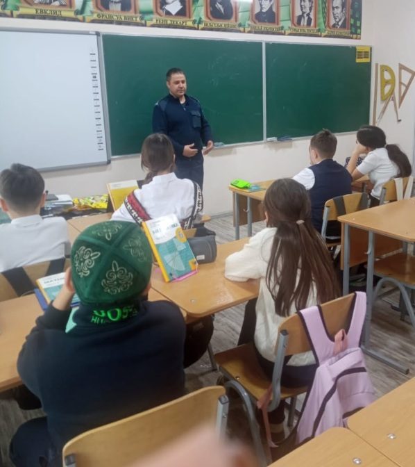 Сегодня 16 марта 2026 года в КГУ”Школа-гимназия №1 г.Щучинск” прошла очередная встреча учащихся с участковым инспектором по делам несовершеннолетних ,лейтенантом полиции Савиновым В.К.
