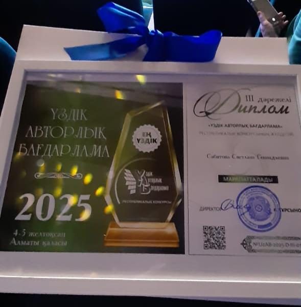 2025 жылғы 4–5 желтоқсан аралығында Алматы қаласында республиканың түкпір-түкпірінен жиналған ең үздік педагогтардың басын қосқан «Үздік авторлық бағдарлама» байқауы өтті. Бәсеке өте жоғары болды: қатысушылар өздерінің авторлық жобаларын, әдістемелік жаңалықтары мен оқытудағы инновациялық тәсілдерін паш етті. Осынау мықтылардың арасында біздің Светлана Геннадьевна өз бағдарламасын жоғары кәсіби деңгейде қорғап шығып, дене шынықтыру мұғалімдері арасында үздік үштікке енді.
